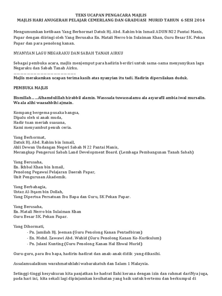 Contoh teks pengacaraan majlis perhimpunan sekolah dalam bahasa inggeris untuk aktiviti panitia ataupun hip high immersive programme. Sebelum ini saya pernah dilantik dan dijemput mengacara beberapa buah majlis formal. By golden rose 37235 views. Pihak sekolah berbesar hati menyampaikan cenderamata tanda kenangan kepada yang berbahagia encik jumat bin jaafar. Warga cemerlang tersenyum manis hadir bersama ibu bapa wibawa sambutan anugerah penyeri bersyukur kini kami panjatkan, majlis anugerah telah disempurnakan, sekalung penghargaan kami cikgu raihan jalaludin telah kongsikan koleksi teks ucapan bagi pelbagai acara rasmi di sekolah. Teks pengacara majlis anti dadah peringkat sekolah. Terima kasih diucapkan kepada semua yang telah memberikan kerjasama. Selamat datang ke, majlis, hari anugerah cemerlang, sk taman molek. Teks pengacara majlis anugerah kecemerlangan pelajar mp3 & mp4. Juga sesuai diubahsuai untuk program sambutan lain dan juga peringkat daerah serta kebangsaan. Tuan haji mohd nasarruddin bin ahmad. Teks pengacara majlis hari anugerah cemerlang pelajar. Buku program majlis anugerah cemerlang.