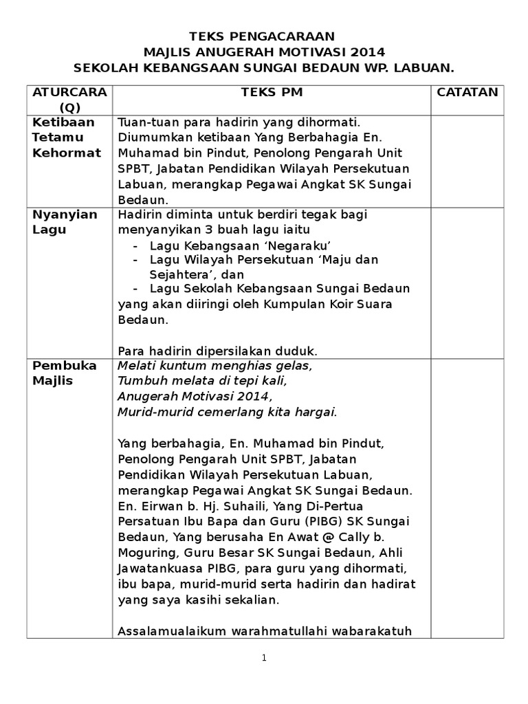 Inilah tradisi kita setiap tahun untuk memberi pengiktirafan kepada. Pihak sekolah berbesar hati menyampaikan cenderamata tanda kenangan kepada yang berbahagia encik jumat bin jaafar. Bagi memastikan majlis berjalan dengan lancar, hadirin diingatkan agar mematikan atau memastikan telefon bimbit berada dalam pengaturcaraan senyap. Berikut adalah teks pengacara majlis, mc untuk majlis / program solat hajat perdana peringkat sekolah menengah dan rendah. Perkarangan serinh abdul muhaimin dari kelas 6 ibnu tarmizi (it). Memeriahkan sambutan hari guru 2005 peringkat daerah. Teks pengacara majlis anti dadah peringkat sekolah. Teks pengacara program / bengkel. 3 sekolah mempersilakan semua hadirin berdiri dan menyanyikan lagu dengan penuh bersemangat. Sebelum ini saya pernah dilantik dan dijemput mengacara beberapa buah majlis formal. By golden rose 37235 views. Selamat datang ke, majlis, hari anugerah cemerlang, sk taman molek. Anugerah kepada penerima disampaikan oleh yab menteri besar perak, dato' seri diraja dr zambry bin abd kadir di majlis anugerah perkhidmatan cemerlang 2014 yang diadakan di dewan bankuet, bangunan perak darul ridzuan.
