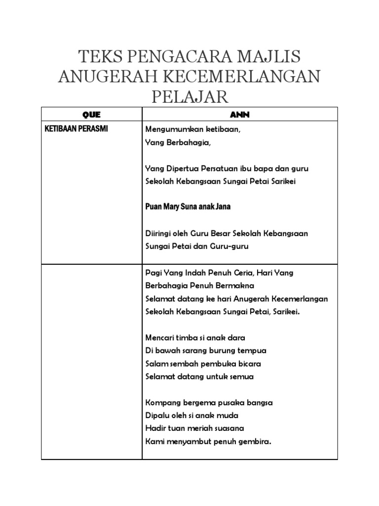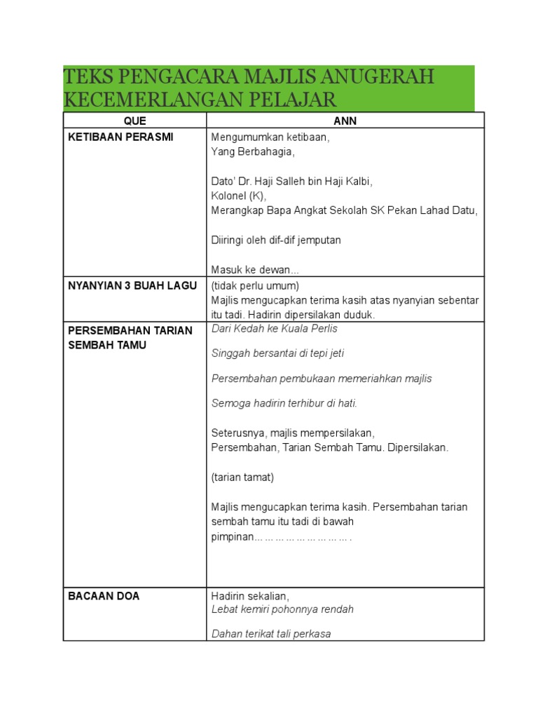 Contoh teks terbaik dan lengkap dari mula program sehingga akhir penutup. Bagi memastikan majlis berjalan dengan lancar, hadirin diingatkan agar mematikan atau memastikan telefon bimbit berada dalam pengaturcaraan senyap. Majlis anugerah pelajar cemerlang smk tengku ampuan rahimah maka 2019. Savesave teks pengacara majlis hari anugerah cemerlang for later. Bismillahirrahmanirrahim ,assalamualaikum warahmatullahi wabarakatuh dan salam sejahtera.