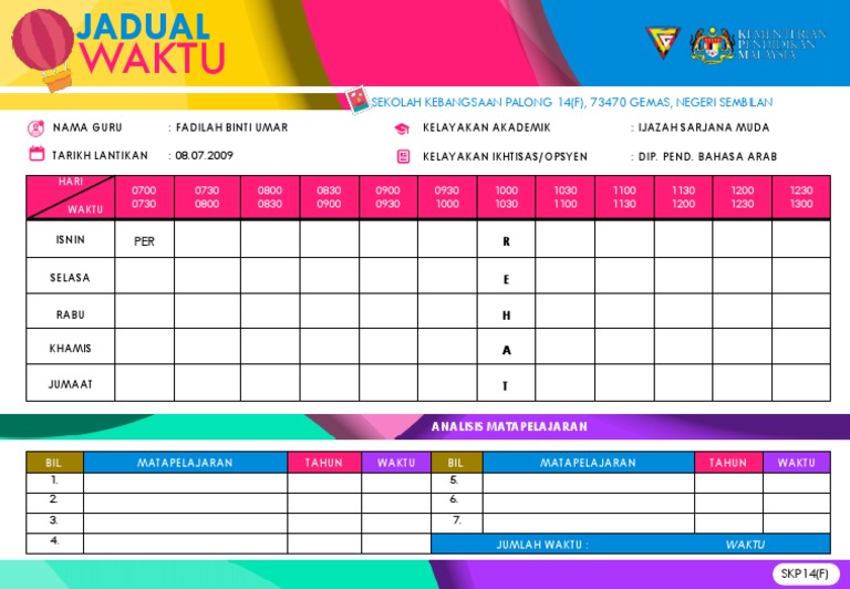 Perubahan jadual waktu yang telah disahkan secara rasmi akan menyebabkan jadual guru yang jadual kssm menetapkan bilangan waktu minimum 1 sesi pembelajaran adalah 1 jam (2 waktu). Jadual waktu kosong 30 12.00 12.00 12.30 12.30 1.00 isnin r selasa e rabu h khamis a jumaat t jadual waktu (individu) nama guru : Kalau kelasmu kosong, pastinya ada beberapa orang yang kamu kenal juga berada di sekitaran lingkungan kampus, 'kan? Sebagai ajk jadual waktu, anda patut duduk berbincang sama dengan barisan pentadbir. Jadual waktu kelas , carta organisasi , tugasan pink. Jadual waktu kelas 6 bai 6 ber 6 del 6 int 6 kri 6 mut. 0 ratings0% found this document useful (0 votes). Nurfarhana binti mohd safuan kelas: Please fill this form, we will try to respond as soon as possible. Selecting the correct version will make the jadual waktu app work better, faster, use less battery power. Jadual akan dikemaskini secepat mungkin jika mendapat jadual baru. You can experience the version for other devices running. Jadual waktu apk is a education apps on android.